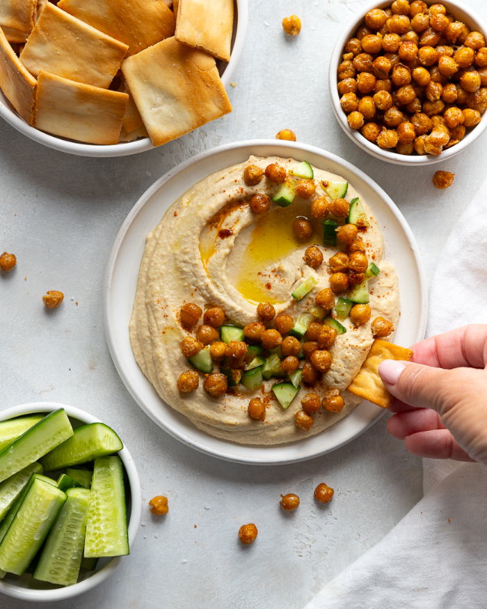 - 삶은 병아리콩에 타히니(참깨 페이스트), 올리브 오일, 레몬즙, 마늘을 넣고 갈아 크리미한 딥으로 만들어 줍니다.
