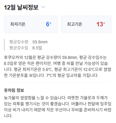 이상으로 12월 한달간의 후쿠오카의 날씨와 추천 옷차림에 대해 알아보았습니다.